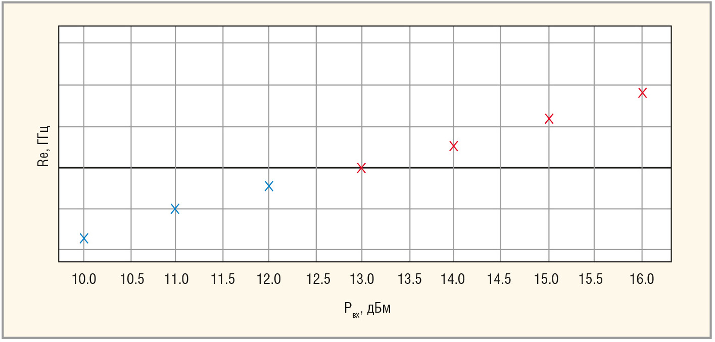Инструмент STAN также позволяет выполнить мультипараметрический анализ, то есть анализ с изменением значений параметров цепи. Этот анализ можно применять для проверки работы цепи в различных условиях или же для контроля критических резонансов, при изменении уровня входной управляющей мощности, импеданса нагрузки или любого параметра внутри цепи. Отслеживание положения критических полюсов цепи позволяет лучше понять динамику цепи и помогает выяснить, какой из параметров влияет на её устойчивость. На рисунке 3 приведено положение полюсов в зависимости от входной мощности и показано, что начиная с уровня 13 дБм появляются авто-колебания.