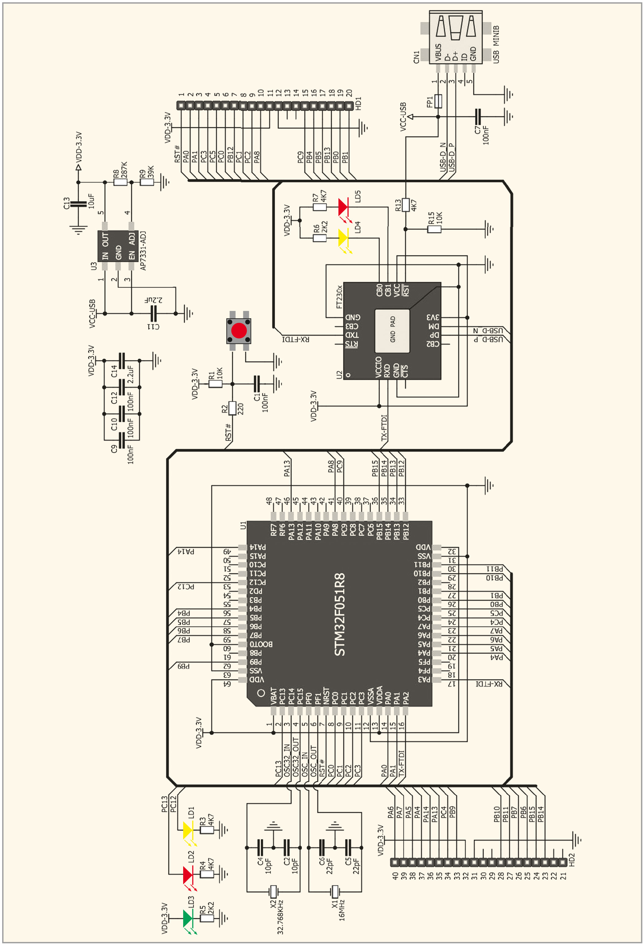 Отладочный модуль MINI-M0 for STM32 разработан на основе микроконтроллера STM32F051R8. Схема отладочного модуля MINI-MO представлена на рисунке 1.