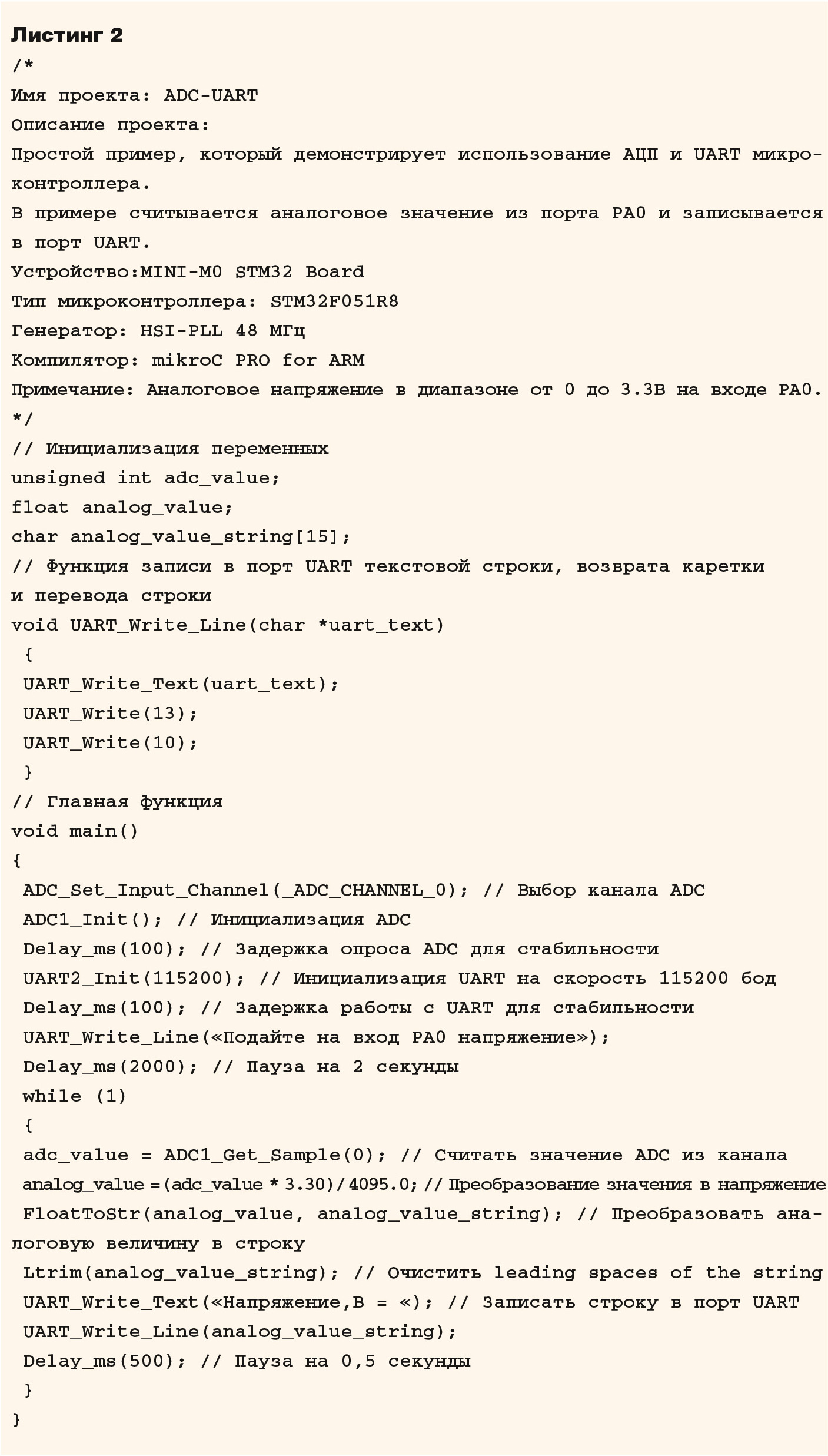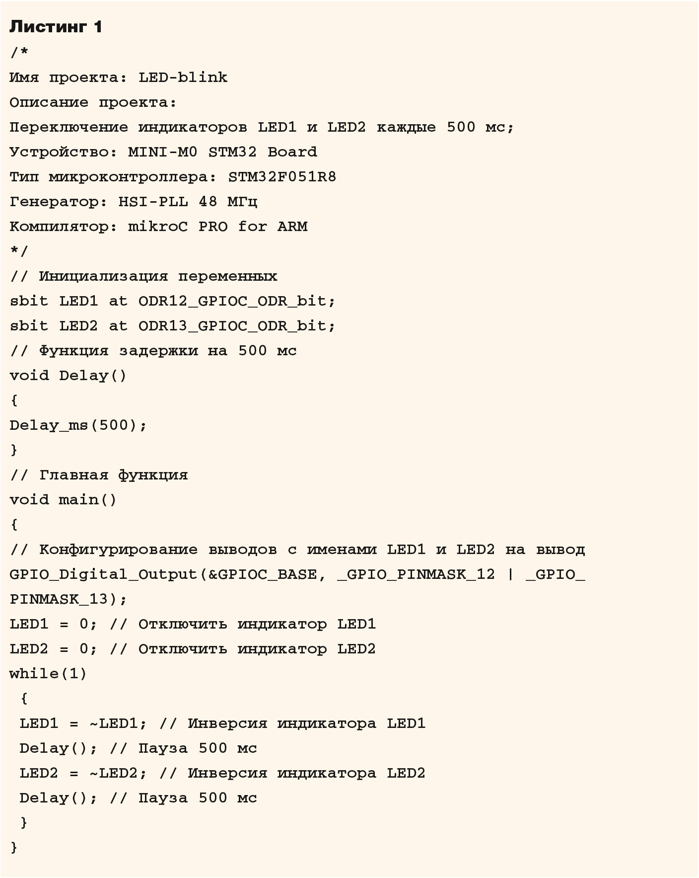 В листингах 1 и 2 приведены готовые примеры программ для отладочного модуля, написанные на языке программирования Си. Каждый пример программы снабжён подробными комментариями на русском языке, из которых понятно назначение программ и их алгоритм. С помощью среды разработки mikroC PRO for ARM и этих программ можно получить загрузочные HEX-файлы для отладочного модуля MINI-M0.
