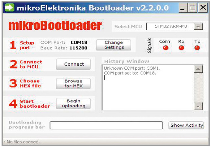 Для загрузки файлов в микроконтроллер отладочного модуля используется загрузчик, который запрограммирован в модуле MINI M0 по умолчанию, и внешняя программа mikroBootloader, устанавливаемая на персональном компьютере.