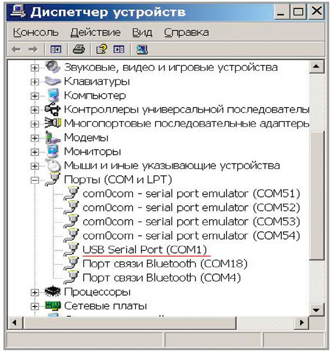 Далее требуется узнать номер порта, назначенного операционной системой компьютера для подключённого отладочного модуля. Это можно сделать с помощью диспетчера устройств компьютера, окно которого показано на рисунке 5.