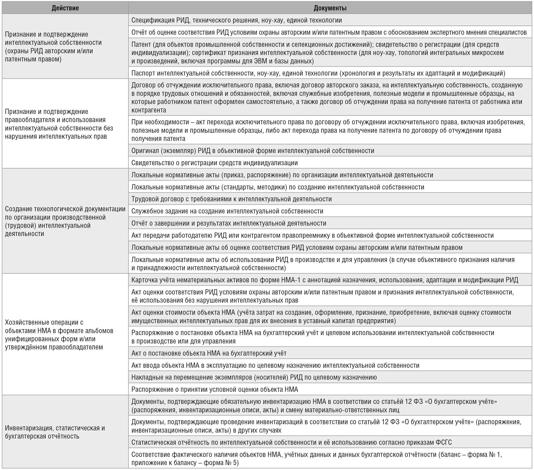 Главная проблема, с которой приходиться сталкиваться, – соответствие объекта НМА одному из указанных в пункте 3 ПБУ 14/2007 признаку, а именно, наличие надлежаще оформленных документов, подтверждающих существование самого актива (необходимо документальное признание предоставления РИД правовой охраны и при этом не нужно путать охранное свидетельство регистрации средств индивидуализации с иного назначения свидетельствами о регистрации программ для ЭВМ и баз данных) и исключительных (имущественных интеллектуальных) прав на интеллектуальную собственность. Состав и содержание этих документов хорошо иллюстрируется в таблице.