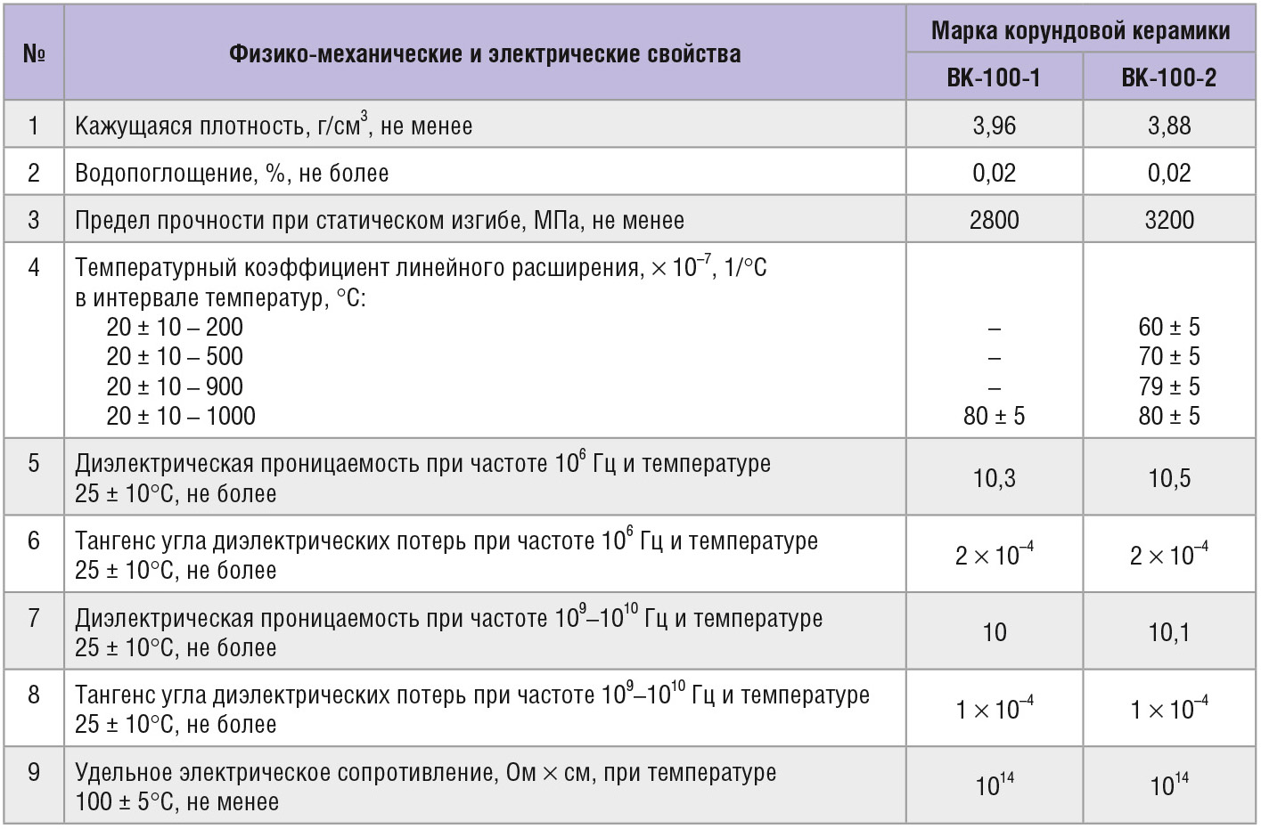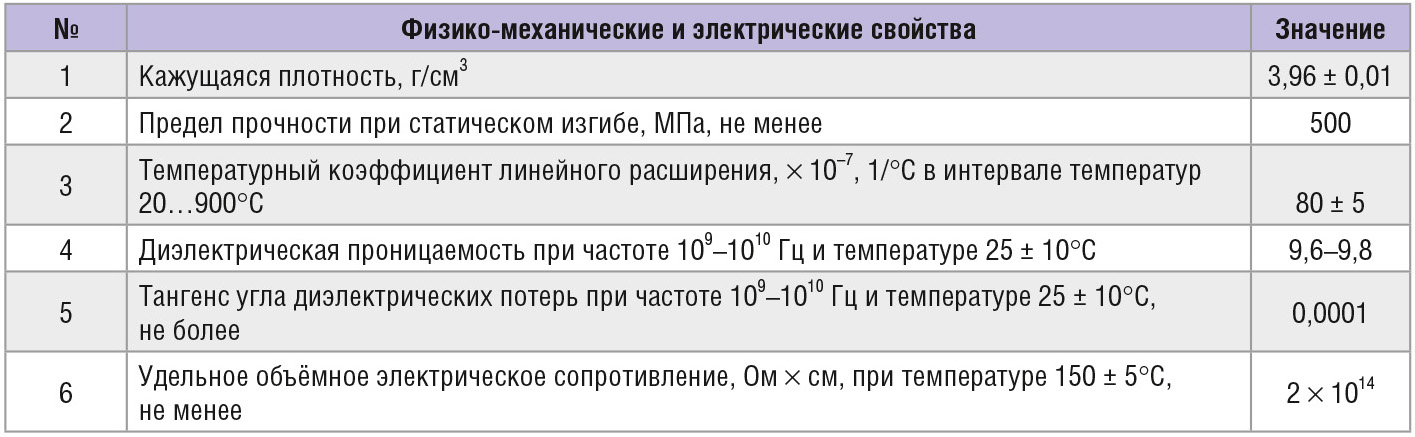 Керамические подложки являются базовым элементом гибридноинтегральных схем (ГИС) для изделий СВЧтехники. Материалом для изготовления керамических подложек, в зависимости от требований к техническим характеристикам прибора, может служить алюмооксидная керамика с содержанием основного вещества от 94 до 100%, бериллиевая керамика, алюмонитридная и другие. Однако массовое производство ГИС ведётся с использованием корундовых керамических подложек (Al2O3). Подложки из Al2O3 имеют высокие физикотехнические и электрические характеристики, которые при повышении содержания оксида алюминия до 99,7% достигают своего максимума. Такая керамика по химическому составу должна соответствовать требованиям, представленным в таблице 1, а по физикомеханическим и электрическим свойствам – в таблице 2 (по данным, взятым из технических условий на вакуумплотную керамику аЯО.027.002ТУ).