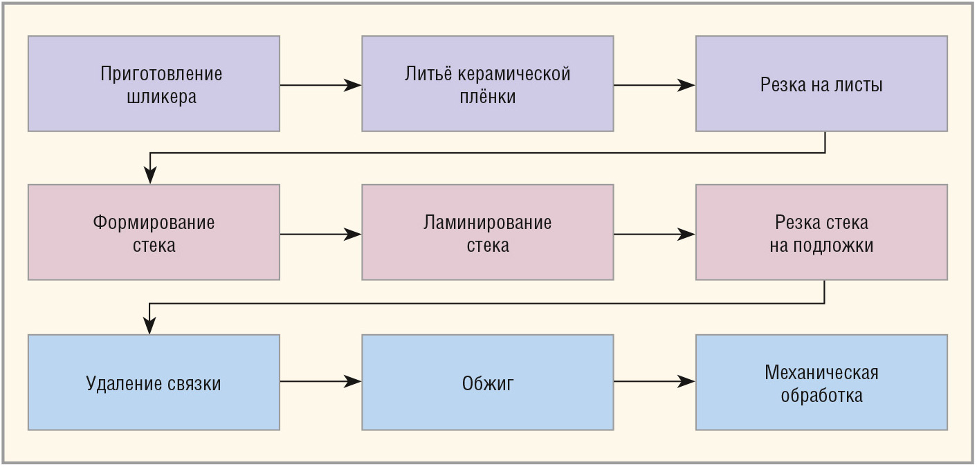 Один из вариантов технологической схемы изготовления керамических подложек методом плёночного литья представлен на рисунке 1.