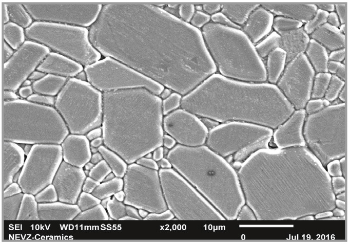 Исследование структуры подложек ВК100 показывает, что керамика состоит из гексагональных кристаллов с чёткими границами. Материал однофазен и обладает плотностью, близкой к теоретической. Максимальный размер кристаллов – 25 мкм.