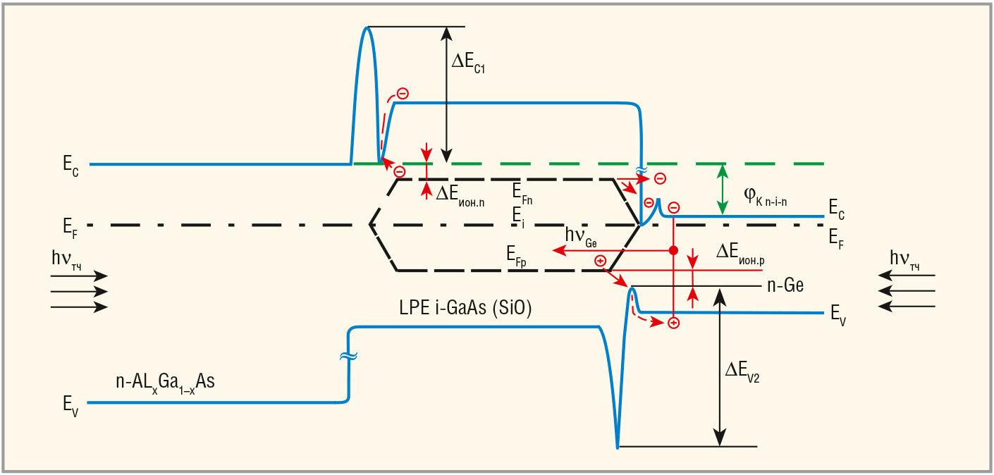 На рисунке 7 показаны энергетические разрывы в зоне проводимости гетероперехода n-i AlGaAs-GaAs ΔEC1 и в валентной зоне i-n гетероперехода GaAs-Ge – ΔEV2. «Встроенные» амфотерные квазиуровни Ферми EFn и EFp показывают уровень концентрации легирующей примеси на основе атомов Si в подрешётках Ga (EFn) и As (EFp).