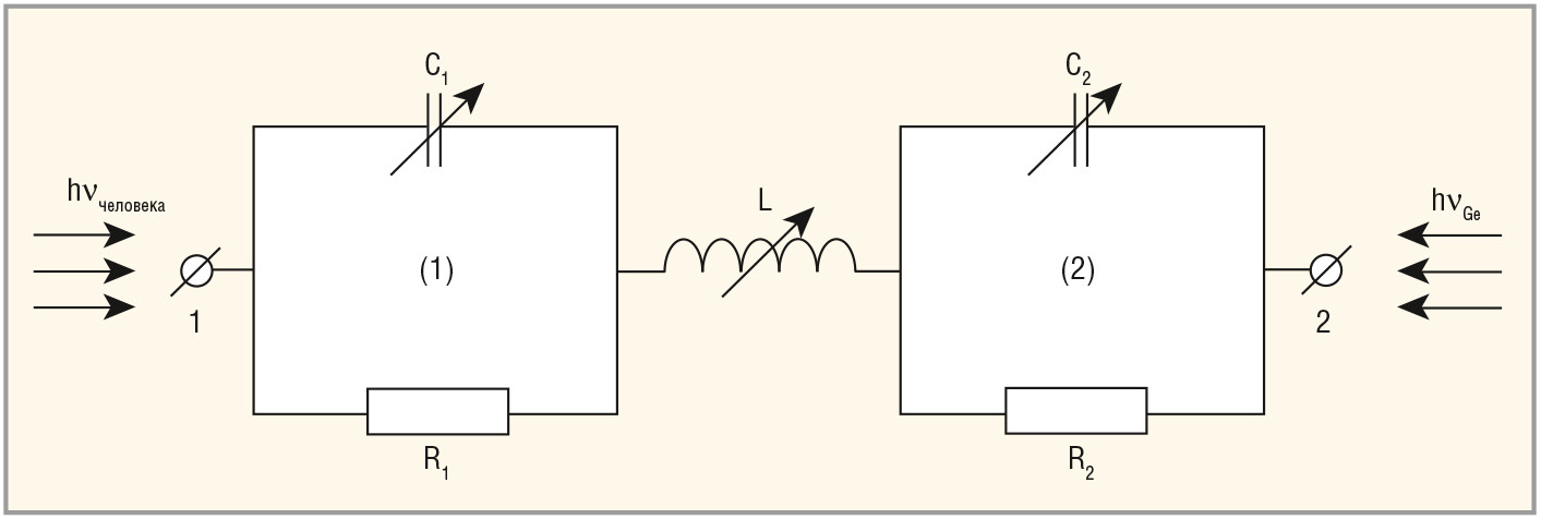 На рисунке 10 приведена эквивалентная схема двух встречно включённых изотипных диодов n-AlGaAs-i-GaAs (1) и n+-Ge-i-GaAs (2) (по аналогии с примером на двух встречно включённых диодах с барьером Шоттки, с очень сложными по профилю энергетическими зонами), на внутреннюю энергию которых воздействуют два типа излучения.