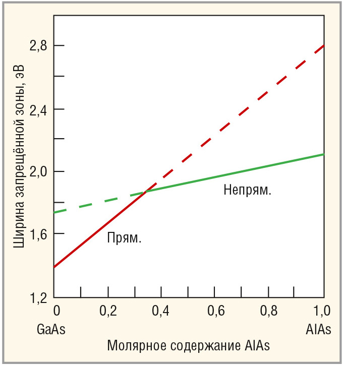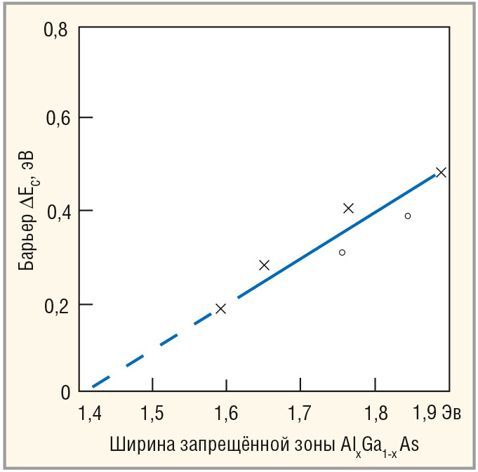 Из графиков видно, что величина ΔECn в системе AlGaAs-GaAs при ширине запрещённой зоны Al0,3Ga0,7As около 1,8 эВ достигает уровня 0,4 эВ.