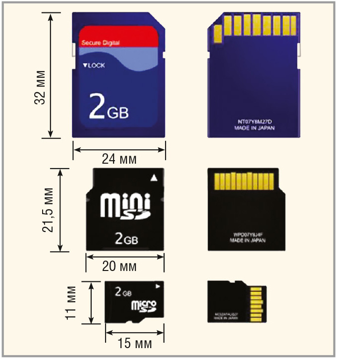 Первые карты памяти SD появились в 1999 г. В настоящее время существуют три разновидности карт памяти SD, отличающиеся по своим габаритным размерам и назначению контактов. Это карты SD, mini SD и micro SD. На рисунке 2 представлены все три типа данных карт памяти, с указанием их размеров.