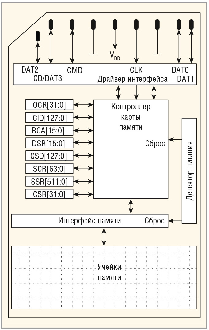 На рисунке 4 приведена структурная схема карты памяти SD. На этой схеме показано устройство карты памяти и состав внутренних регистров, доступных для чтения по интерфейсу карты.