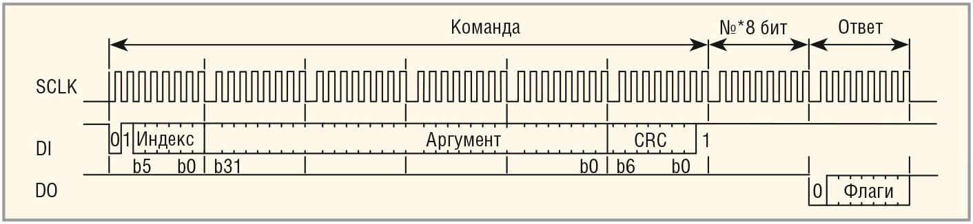 Кадр команды, передаваемый от микроконтроллера к карте, имеет фиксированную длину в 6 байт. Формат обмена данными между микроконтроллером и картой памяти по интерфейсу SPI приведён на рисунке 6.