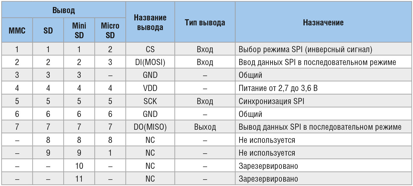 Карты памяти SD могут поддерживать несколько режимов обмена данными. Одним из таких режимов является относительно простой и открытый интерфейс SPI (Serial Peripheral Interface). Данный режим обмена данными поддерживают карты памяти SD и MMC. Назначение контактов для всех карт памяти приведено на рисунке 3.