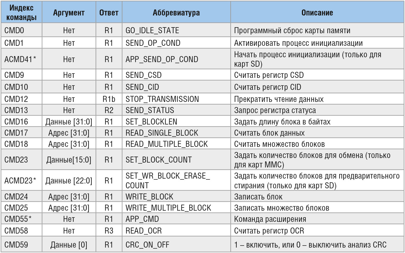 В режиме SPI для всех команд отведено 6 бит, поэтому количество команд не может превышать 64. Все команды имеют условное обозначение CMD с номером от 0 до 63, который именуют индексом команды. Кроме того, каждой команде назначено индивидуальное имя в виде аббревиатуры, например GO_IDLE_STATE. Первый байт пакета команды состоит из комбинации двух бит 0 и 1 начала команды и шести бит индекса команды. Например, для команды CMD0 первый байт будет иметь значение 0x40, а для команды CMD59 – 0x7B. В таблице 2 приведён краткий перечень команд, используемых для чтения, записи и инициализации карты памяти.