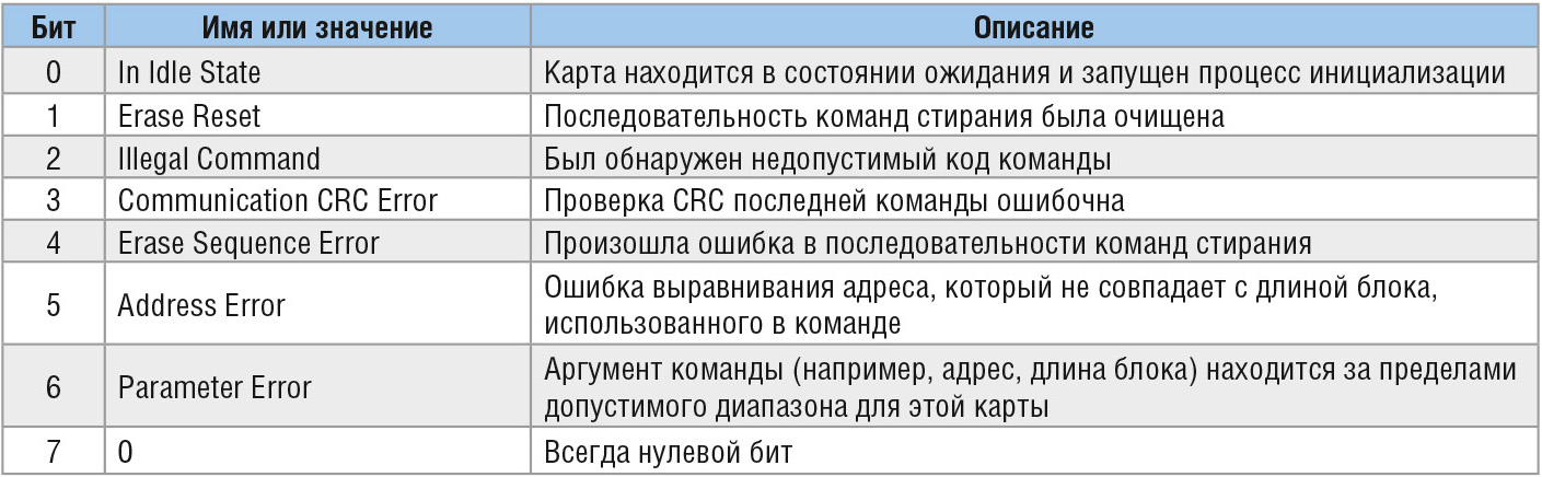 Существует три типа ответа карты памяти на команду. Эти ответы имеют следующие условные обозначения: R1, R2 и R3. Тип ответа зависит от принятой команды. Для большинства команд возвращается байт ответа R1. Назначение бит в байте ответа R1 приведено в таблице 3.