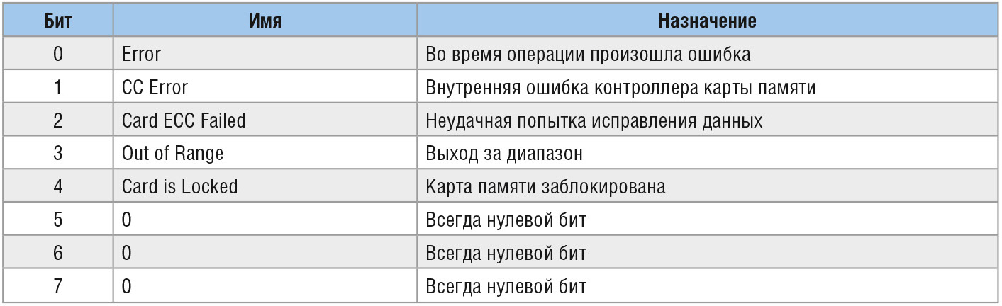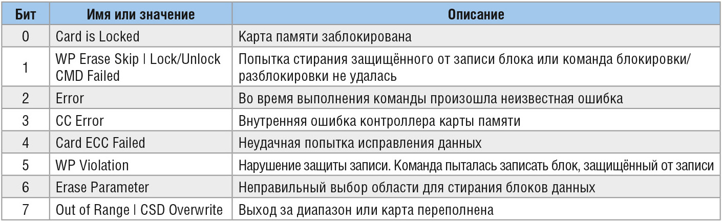 Ответ R2 возвращается только для команды запроса регистра статуса CMD13. Он состоит из двух байт. Его первый байт представляет собой ответ R1. Назначение всех бит второго байта ответа R2 приведено в таблице 4.