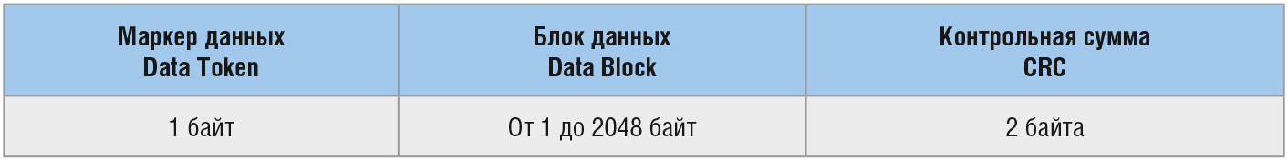 В процессе обмена данными с картой памяти, после ответа на команду может быть получен один или несколько пакетов данных. Пакет данных состоит из маркера данных (DataToken), блока данных (Data Block) и контрольной суммы CRC. Формат пакета данных приведён в таблице 5.