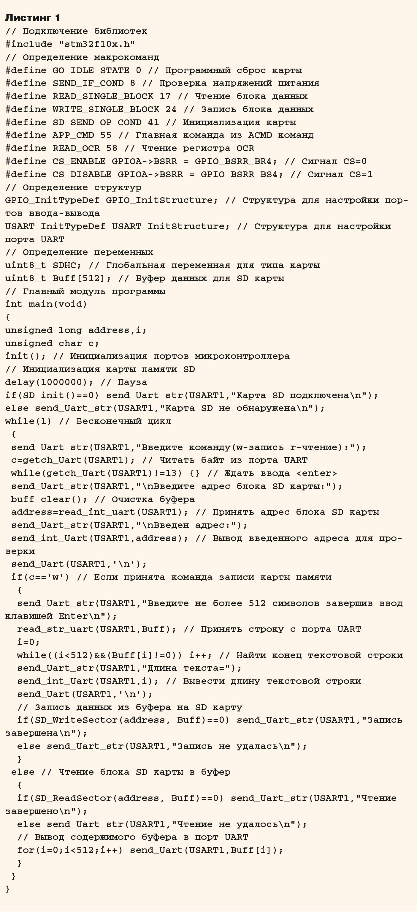 В приведённой программе использован набор функций для настройки портов и обращения с картой памяти. Данный набор функций приведён в листинге 2 (см. дополнительные материалы к статье на сайте журнала www.soel.ru).