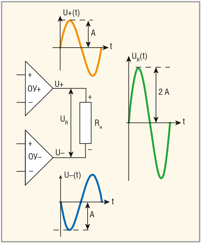 Пусть с выхода первого ОУ (например, верхнего на рисунке 1) поступает синусоидальный сигнал U+(t) с амплитудой A, а со второго – инверсный по отношению к первому сигнал U–(t) с той же амплитудой. Нетрудно заметить, что если подключить нагрузку Rн к выходам обоих ОУ, т.е. «проложить мост» в виде резистора Rн между ними (отсюда и название способа включения), то амплитуда сигнала на нагрузке UR будет равна удвоенному значению амплитуды A, т.е. UR = 2 А, поскольку амплитуды обоих сигналов складываются. Здесь следует заметить, что по сравнению со стандартным включением ОУ, где нагрузка заземлена (т.е. имеет постоянный потенциал, равный нулю), в мостовом включении потенциал «земли» «плавает». Другими словами, когда потенциал верхнего по схеме вывода резистора (+) достигает максимума (равного +A), потенциал нижнего вывода (–) достигает минимума, равного –A, и наоборот.