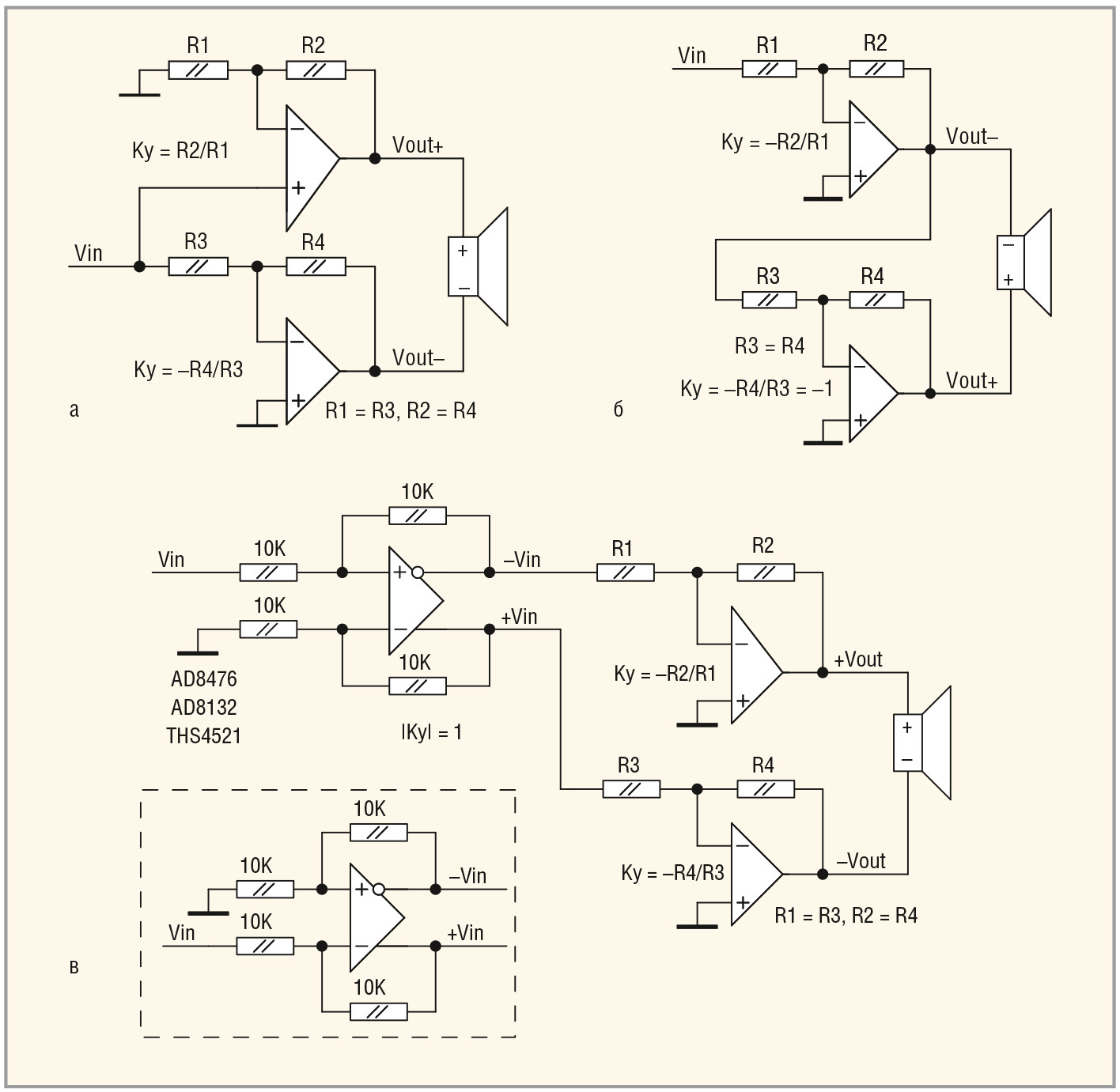 В третьей схеме (см. рис. 2в) на входе стоит ОУ с дифференциальными (парафазными) выходами. Оба мощных ОУ одинаково включены в инвертирующем режиме, поэтому имеют существенно сниженный КНИ + Ш. Однако входное сопротивление схемы низкое (в данном случае – 10 кОм), и подключать высокоомный регулятор громкости напрямую к ней нельзя. Кроме того, хотя ОУ с парафазными выходами и выдаёт два инверсных друг относительно друга выходных сигнала высокого качества, в выходном напряжении двух мощных ОУ всё равно будет присутствовать постоянная составляющая из-за наличия неизбежных тока смещения и напряжения сдвига. Это приведёт к тому, что опять придётся использовать разделительные конденсаторы (как на входах каждого из ОУ, так и на выходах). Кроме того, недорогие микросхемы ОУ с парафазным выходом, например, AD8132 и THS4521, работают на частотах свыше 100 МГц, и их нерационально применять из-за достаточно высокого уровня шума, который они вносят в звуковом диапазоне. В нашем случае наиболее целесообразно применение прецизионного низкочастотного (до 250 кГц) ОУ AD8476, однако он очень дорог (500–800 рублей).