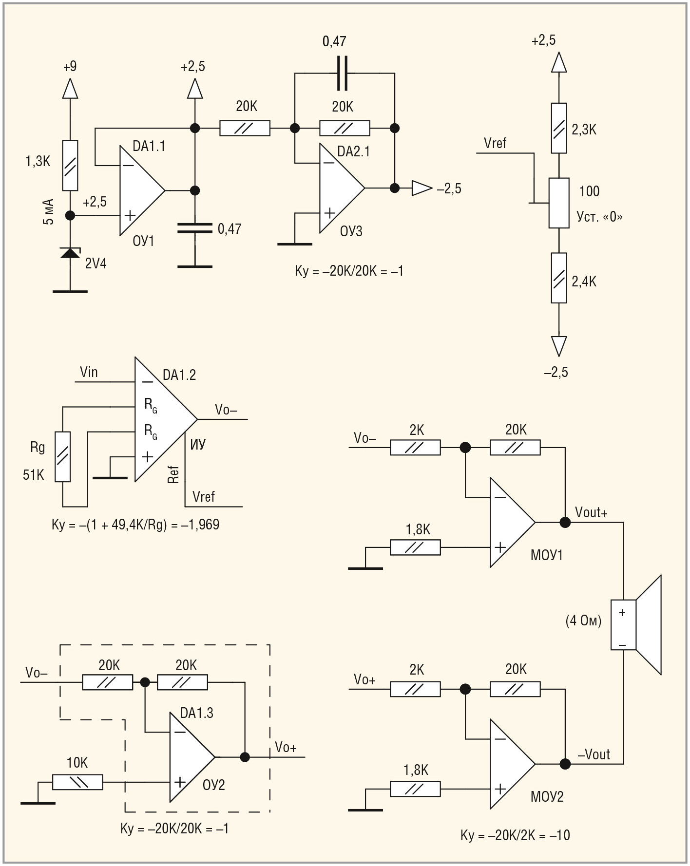Два мощных ОУ (МОУ1 и МОУ2) идентично включены в инвертирующем режиме с коэффициентом усиления, равным отношению резистора обратной связи (20 кОм) к входному резистору (2 кОм), т.е. Ку = –10. Резистор 1,8 кОм, подключённый к неинвертирующим входам обоих ОУ, компенсирует ток смещения и значительно снижает напряжение сдвига каждого ОУ. Сумма токов через резисторы 2 и 20 кОм при потенциалах инвертирующего и неинверитирующего входов ОУ, практически равных потенциалу «земли», должна равняться току через резистор 1,8 кОм (20 кОм || 2 кОм).
