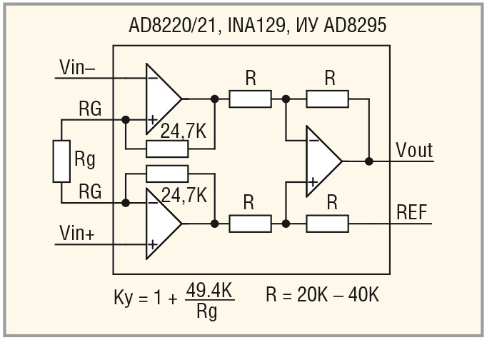 В состав микросхемы AD8295, помимо ИУ (DA1.2), входят два вспомогательных ОУ. Один из них – обычный ОУ1 (DA1.1), второй – обычный ОУ2, дополненный двумя встроенными прецизионными резисторами по 20 кОм каждый (DA1.3 с резисторами, обозначенный на схеме пунктиром).