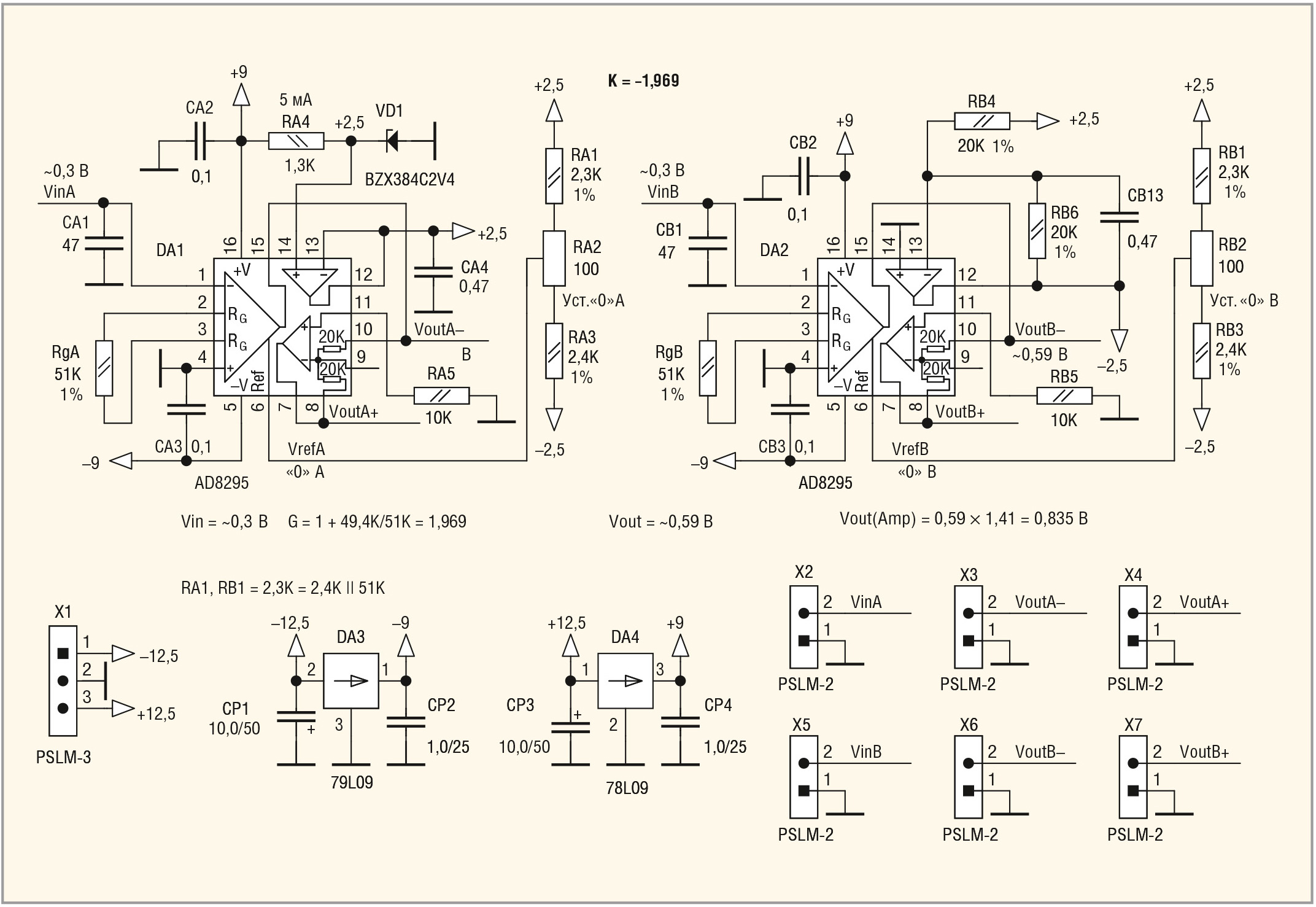 Входные напряжения VinA и VinB, полученные с регулятора громкости, с максимальным действующим значением » 0,3 В, подаются с двух двухконтактных цанговых штыревых разъёмов PSLM-2 (X2 и X5) на два соответствующих инвертирующих входа ИУ микросхем AD8295 (DA1 и DA2). Конденсаторы CA1 и CB1 шунтируют входы по ВЧ. Резисторы RgA и RgB определяют коэффициент усиления ИУ. Этот коэффициент, как было уже показано, составляет около 2. В этом случае действующие значения выходных напряжений каждого ИУ (VoutA– и VoutB–) равны удвоенному входному напряжению и составляют ≈0,6 В, с амплитудным значением в √2 раз большим и приблизительно равным 0,8 В. С делителей RA1, RA2, RA3 и RB1, RB2, RB3 опорные напряжения VrefA и VrefB подаются на входы Ref DA1 и DA2. Резисторы RA1 и RB1 (2,3 кОм) составлены из двух параллельно соединённых резисторов номиналом 2,4 и 51 кОм. Для получения опорного напряжения +2,5 В используется стабилитрон BZX384C2V4 (VD1) с токоограничительным резистором RA4 и повторитель на ОУ, входящий в состав DA1. Для получения опорного напряжения –2,5 В используется инвертор на ОУ, входящий в состав DA2, и два одинаковых резистора по 20 кОм каждый (RB4, RB6). Инвертор оснащён НЧ-фильтром (конденсатор CB13 в обратной связи). Для получения сигналов VoutA+ и VoutB+, инверсных сигналам, соответственно, VoutA– и VoutB–, используются инверторы на ОУ со встроенными прецизионными резисторами по 20 кОм каждый. Эти инверторы реализованы в DA1 и DA2.