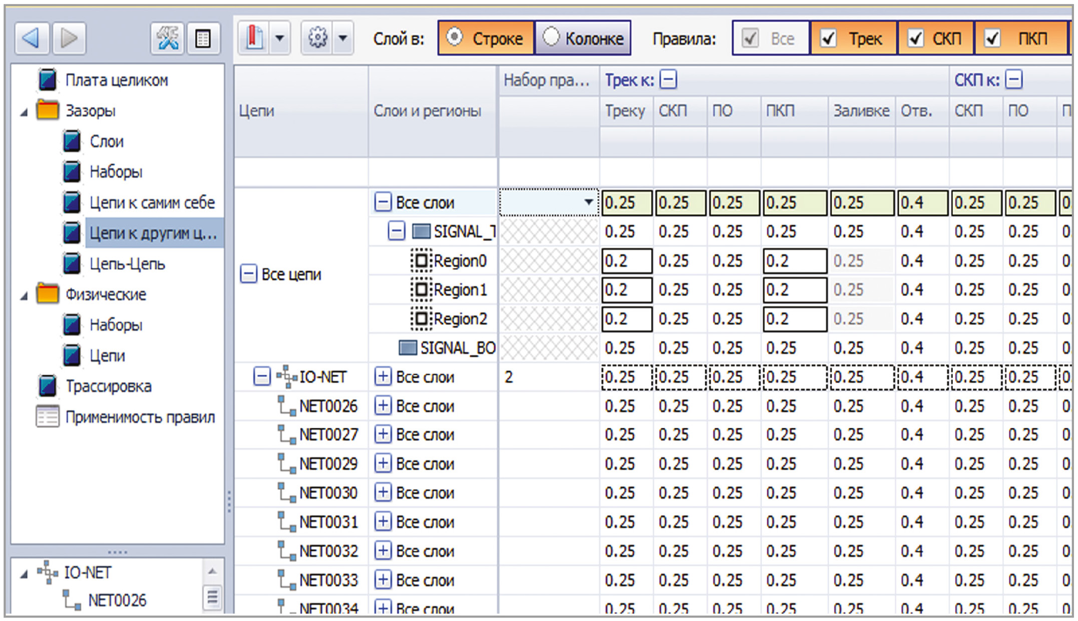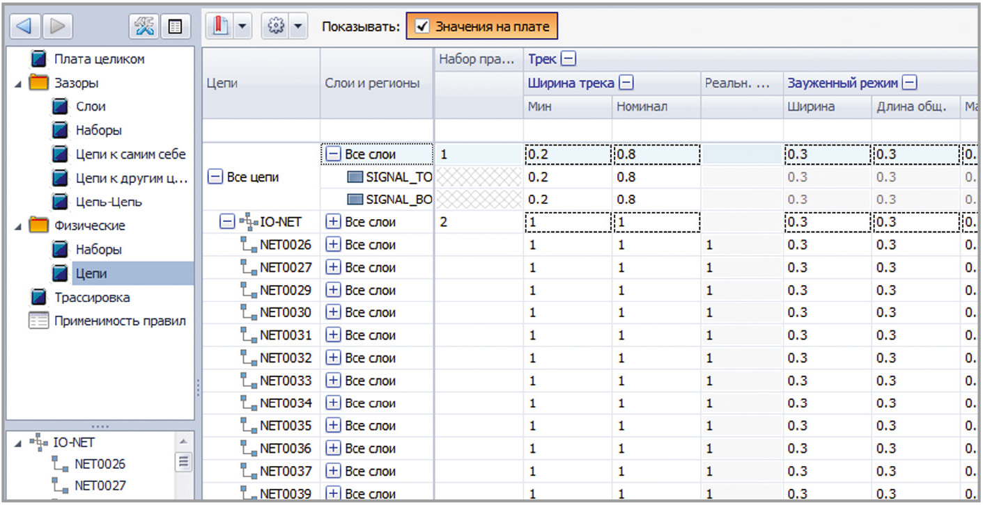 «Физические» правила, аналогично правилам домена зазоров, определяются для платы целиком, а затем могут быть уточнены для класса цепей, дифференциальной пары или конкретной цепи в разрезе слоёв ПП.
