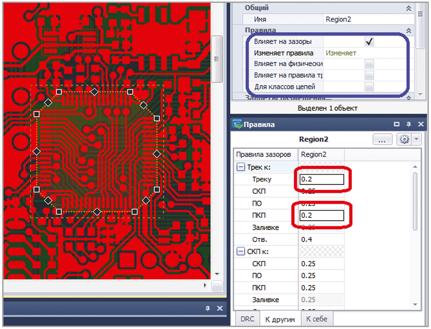 После этого можно задавать уже сами правила в общей для домена идеологии. При этом регион переопределяет правила для своего слоя. В примере на рисунке 4 в регионе указано изменение правил зазоров от трека к другому треку и планарной контактной площадке для всех цепей проекта.