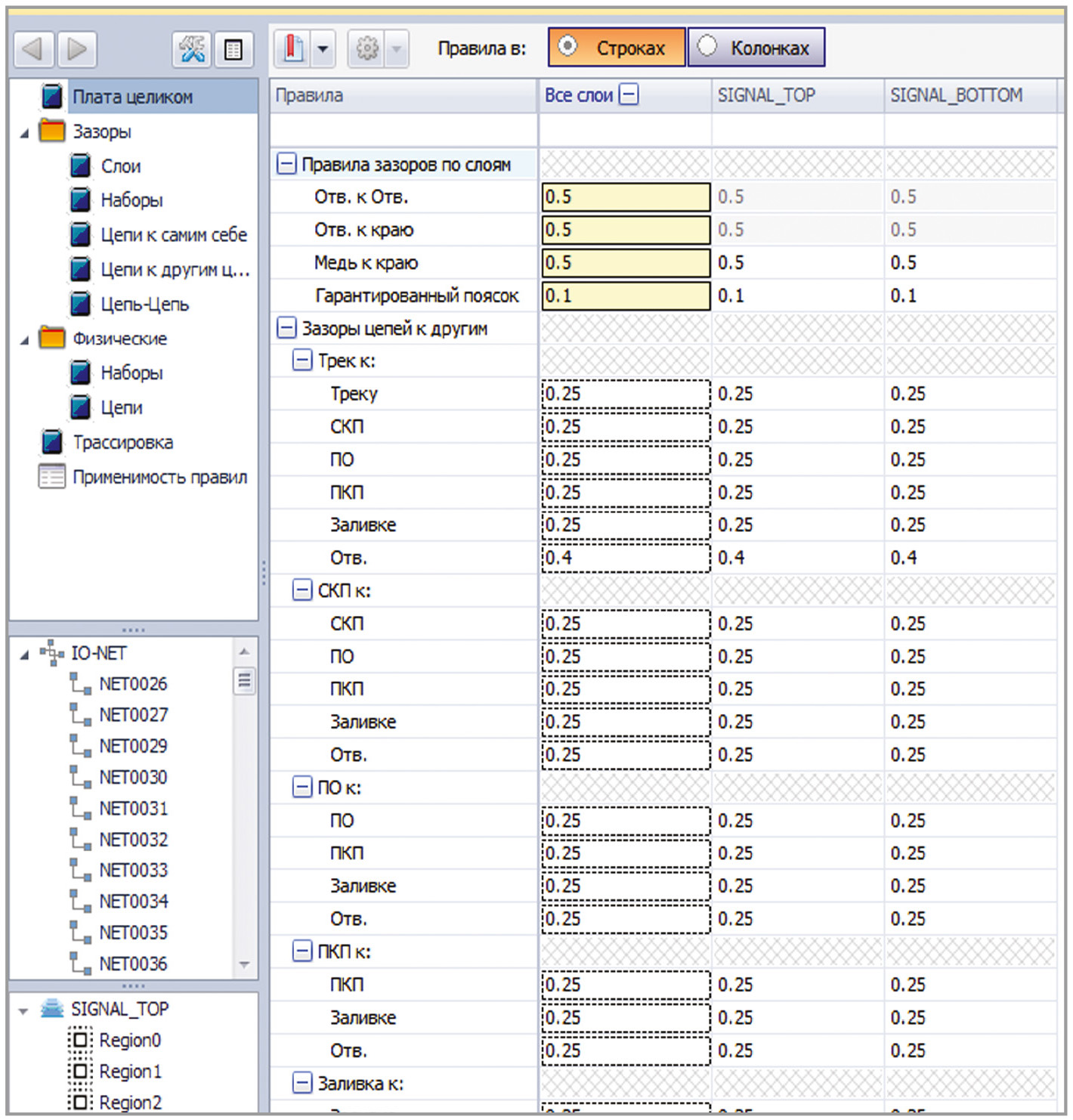 - иерархичность ведения правил (правила задаются вначале для платы в целом, а затем уже уточняются для определённых цепей и слоёв);