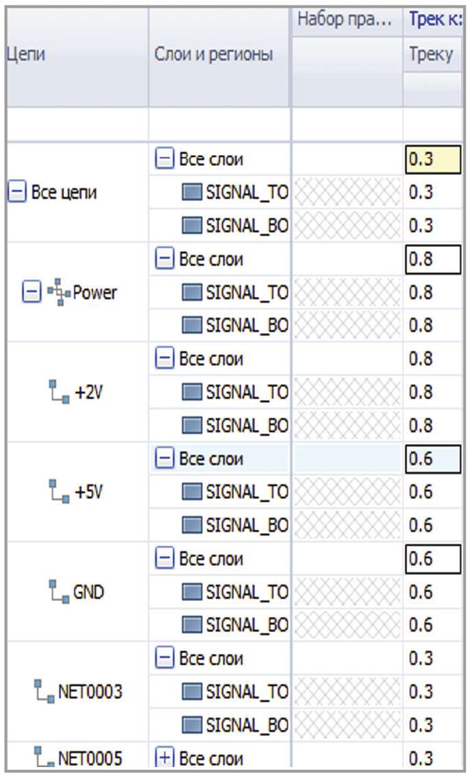 - для класса цепей Power значение этого правила переопределено как 0,8 мм, а для цепей +5V и GND – как 0,6 мм (на уровне отдельных цепей).
