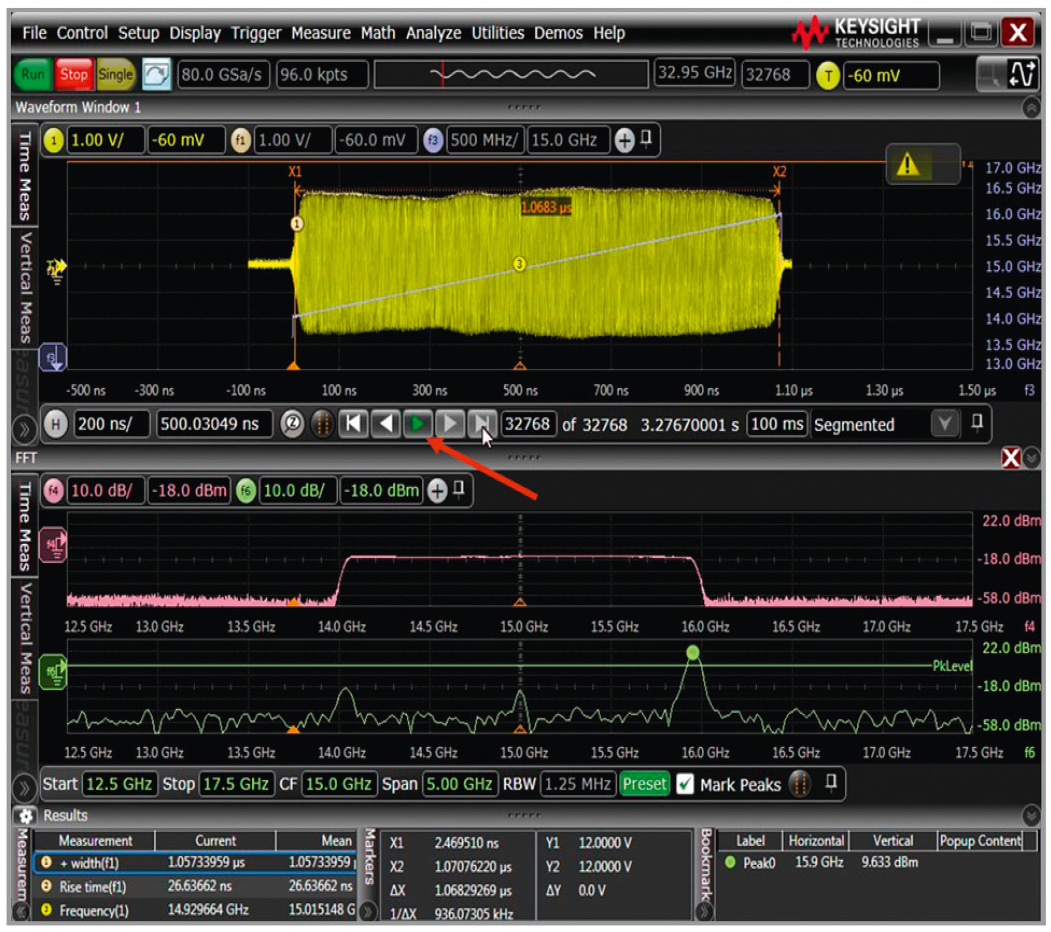 На рисунке 3 показан сегментированный захват импульсного ВЧ-сигнала с несущей частотой 15 ГГц и шириной линейной частотной модуляции (ЛЧМ) 2 ГГц. Обратите внимание, что здесь имеется копка «Play» (воспроизведение), которая позволяет воспроизвести 32 000 сегментов. Причём для 32 000 захваченных импульсов рассчитаны статистические показатели.