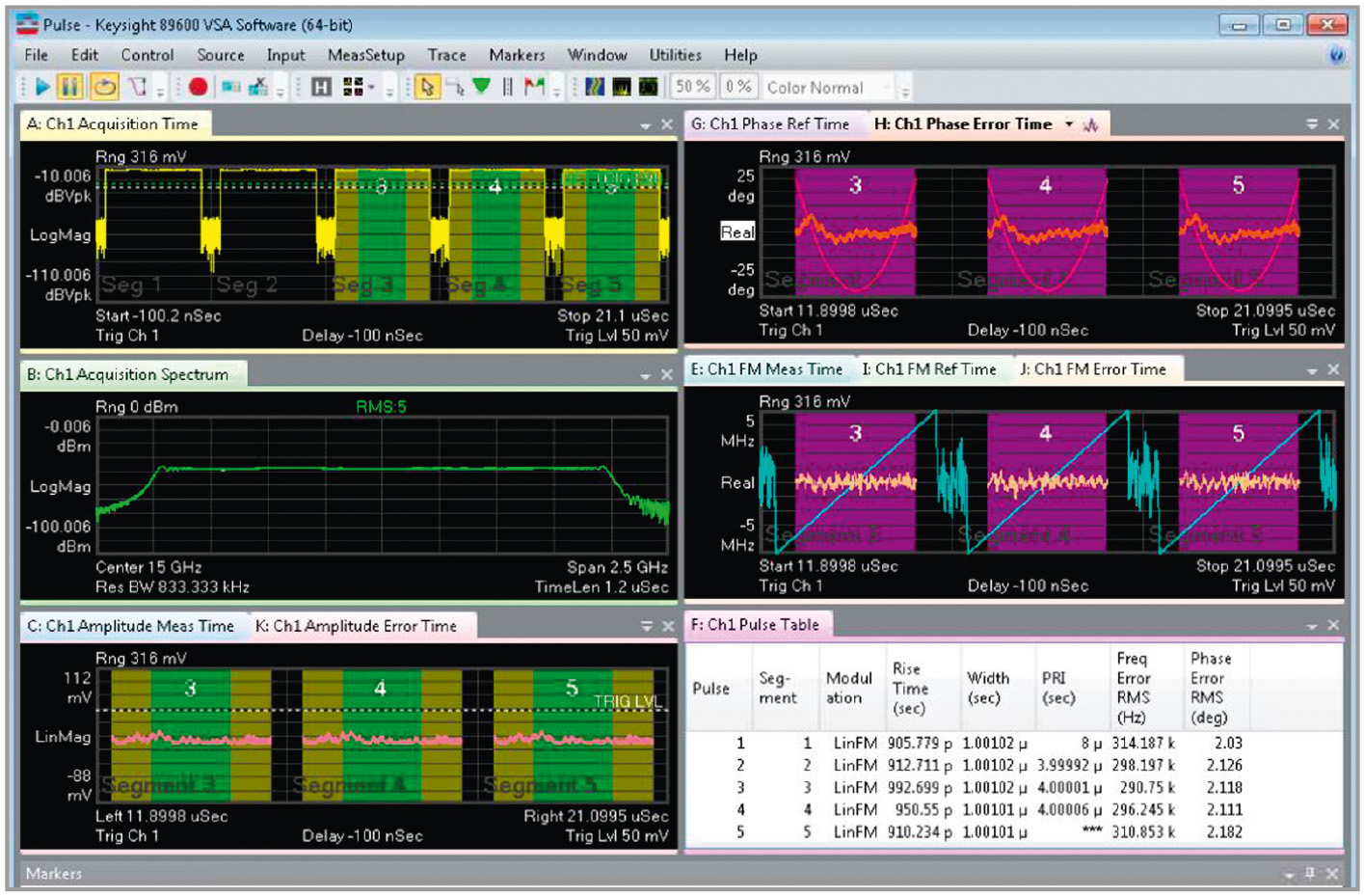 ПО анализа импульсов может управлять сегментированным захватом и в цифровом виде преобразовывать захваченные ВЧ-сигналы в модулирующие I/Q-сигналы. Это позволяет настроить измерение на нужную частоту несущей и выбрать полосу обзора чуть шире полосы исследуемого сигнала, уменьшив тем самым шум и увеличив точность измерения.