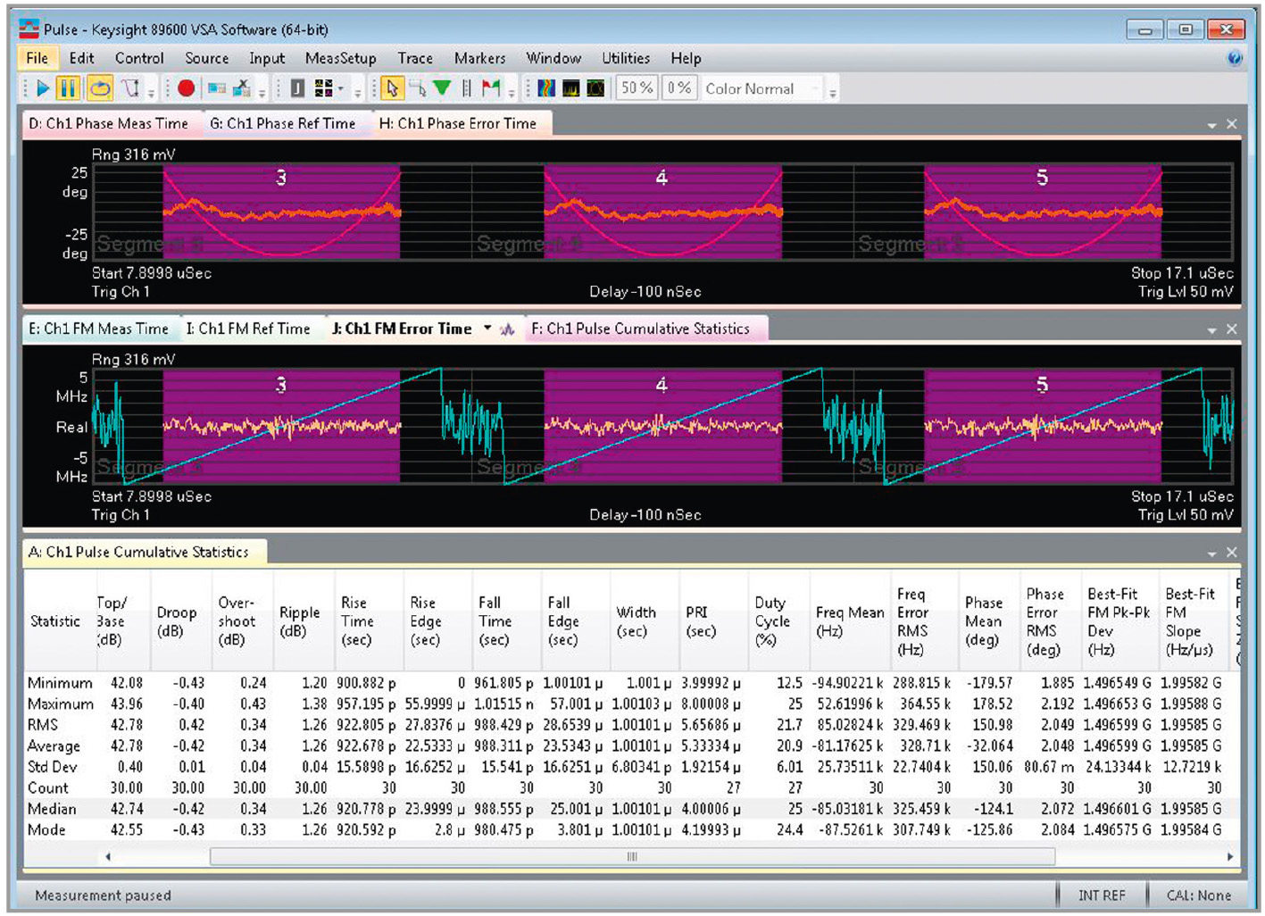 Импульсные измерения в ВЧ-, СВЧ- и КВЧ-диапазонах сопряжены с определёнными трудностями, связанными с необходимостью широкой полосы анализа, а также из-за стремления оценить значительный период активности системы. В данной статье представлено применение с этой целью сегментированной памяти осциллографа и программного обеспечения анализа импульсов – подробно описывается методика для измерения таких параметров РЛС и систем РЭБ, как амплитуда, частота и фаза импульсов, приводятся способы оптимизации точности.