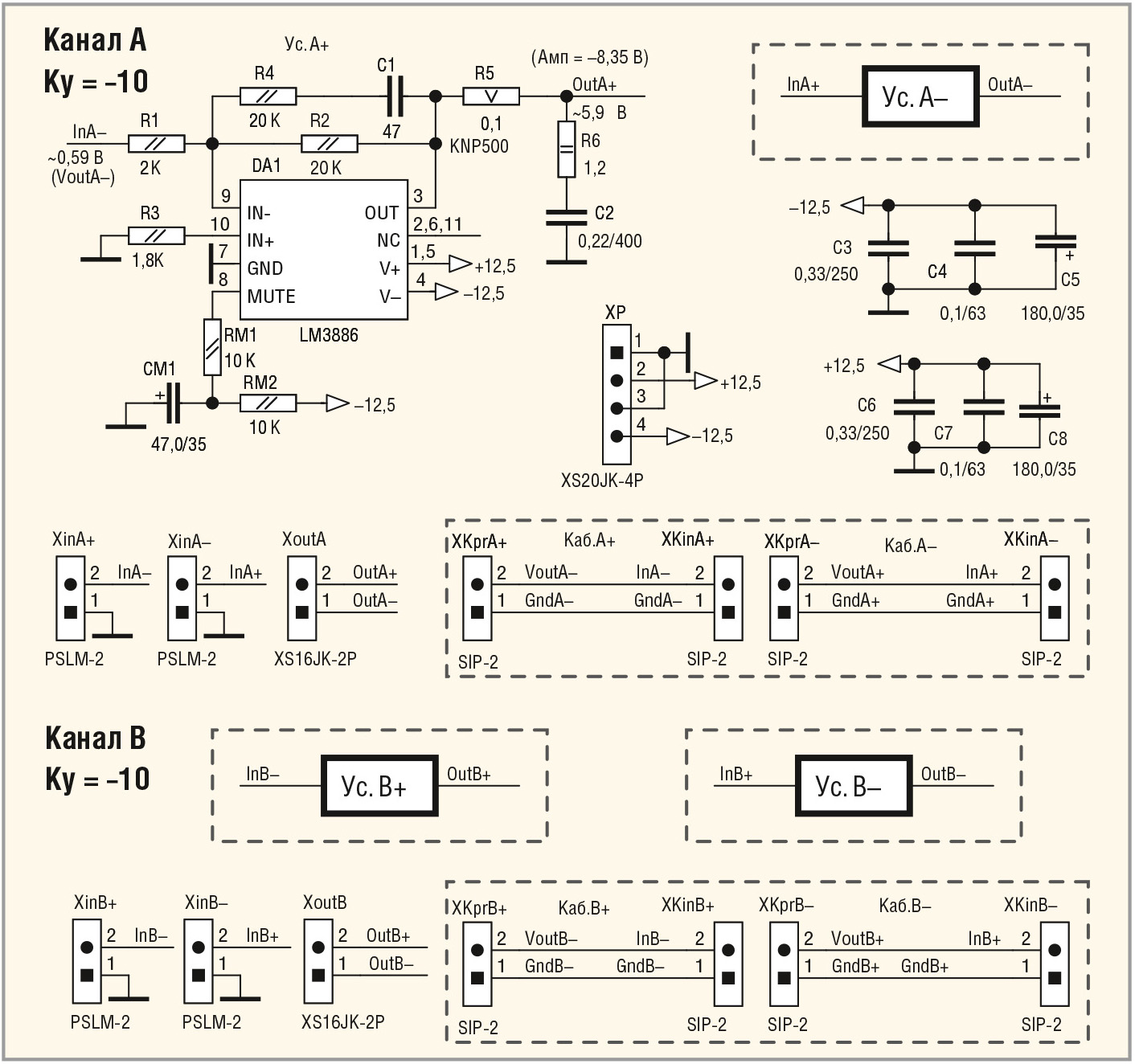 Входные сигналы (InА– и InА+), поступающие с предварительного усилителя, подключаются к двум двухконтактным цанговым штыревым разъёмам XinA+ и XinA– типа PSLM-2. С платы предварительного усилителя (см. рис. 5) эти сигналы поступают по кабелю, показанному в пунктирном прямоугольнике в нижней правой части схемы.