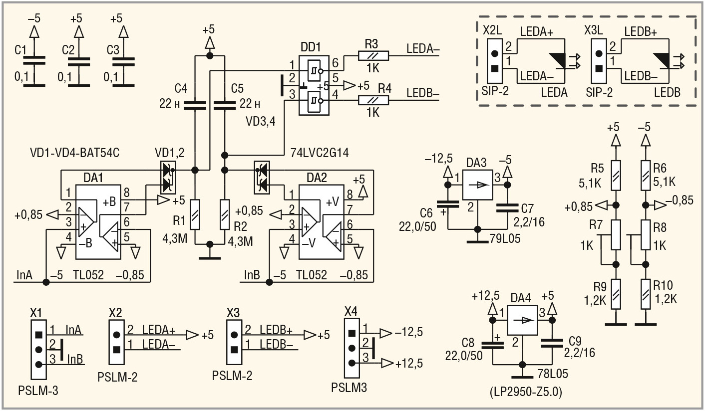Оба выхода ОУ DA1 подключены к анодам диодов VD1 и VD2, катоды которых соединены и одновременно подключены к RC-цепочке R1C4 и к входу верхнего триггера Шмитта DD1. Выход триггера Шмитта подключён к токо-ограничительному резистору R3, второй вывод которого (сигнал LEDA–) через двухконтактный цанговый штыревой разъём X2 типа PSLM-2 и кабель с ответным разъёмом X2L типа SIP-2 подсоединён к катоду светодиода LEDA. Анод этого светодиода подключён к напряжению питания +5 В (сигнал LEDA+).