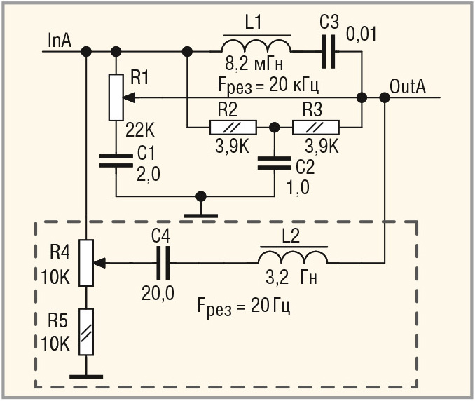 ТКРГ, в котором АЧХ при регулировке громкости более приближены к кривым равной громкости, был описан в рабо-те [3]. Этот регулятор основан на резонансном контуре, настроенном на частоту 20 Гц. Снижение добротности контура позволило получить кривые резонанса, форма которых близка к кривым равной громкости. Однако из-за того, что частота резонанса Fрез очень мала (20 Гц), для создания подобного резонансного контура потребуется применение ёмкостей и индуктивностей очень больших номиналов, а именно – их произведение должно быть 6,33 × 10–5 Гн.Ф. Учитывая, что , при L = 3,2 Гн, ёмкость C составит 20 мкФ. В связи с этим вместо индуктивности был использован так называемый гиратор, т.е. схема на ОУ, моделирующая индуктивность. Однако сложность схемы, масса дополнительных регулировок, недостаточная коррекция (менее 30 дБ), существенное отклонение АЧХ от кривых равной громкости в области ВЧ, а главное – применение дополнительного ОУ, который неизбежно будет «шуметь», вызывают сомнения в высоком качестве подобного регулятора громкости.