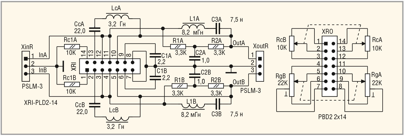 На рисунке 10 приведена принципиальная схема двухканального ТКРГ. В схеме используются кольца Т2010CF199 (LcA, LcB) и катушки индуктивности 8,2 мГн для поверхностного монтажа CM565050 822J (L1A, L1B). Входные сигналы InA и InB подаются на входной трёхконтактный цанговый штыревой разъём XinR типа PLSM-3. Выходные сигналы OutA и OutB выведены на такой же разъём XoutR. В схеме применён 14-контактный разъём XRI типа PLD2-14 (двухрядные штыри с шагом 2 мм), к которому подключается ответный разъём XRO типа PBD2 2x14 с подключёнными к нему сдвоенными переменными резисторами RcA–RcB (НЧ-коррекция) и RgA–RgB (регулировка громкости). Подключение выполнено двумя 6-проводными кабелями в экранирующей оплётке, которая заземлена.