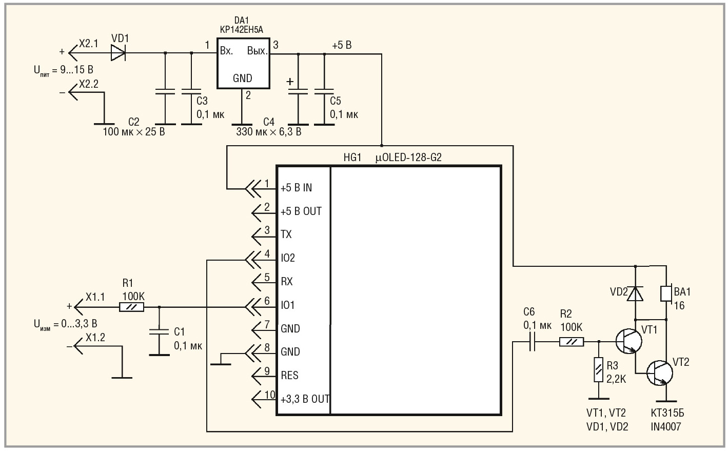 Принципиальная схема встраиваемого милливольтметра на базе дисплейного модуля µOLED-128-G2 изображена на рисунке 4 (исходный текст программы см. в дополнительных материалах к статье на сайте www.soel.ru).