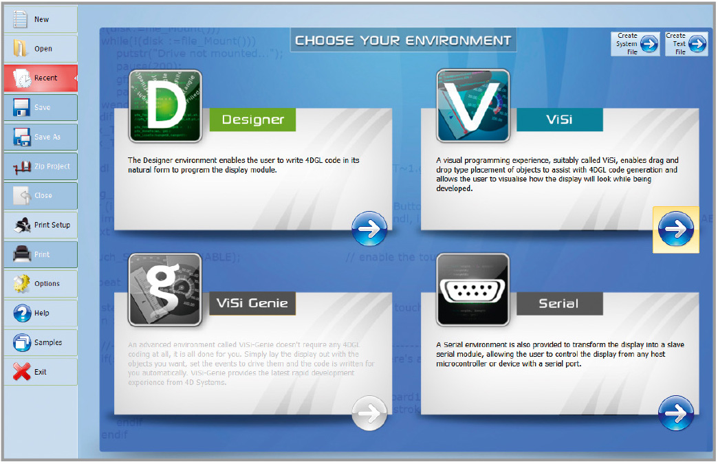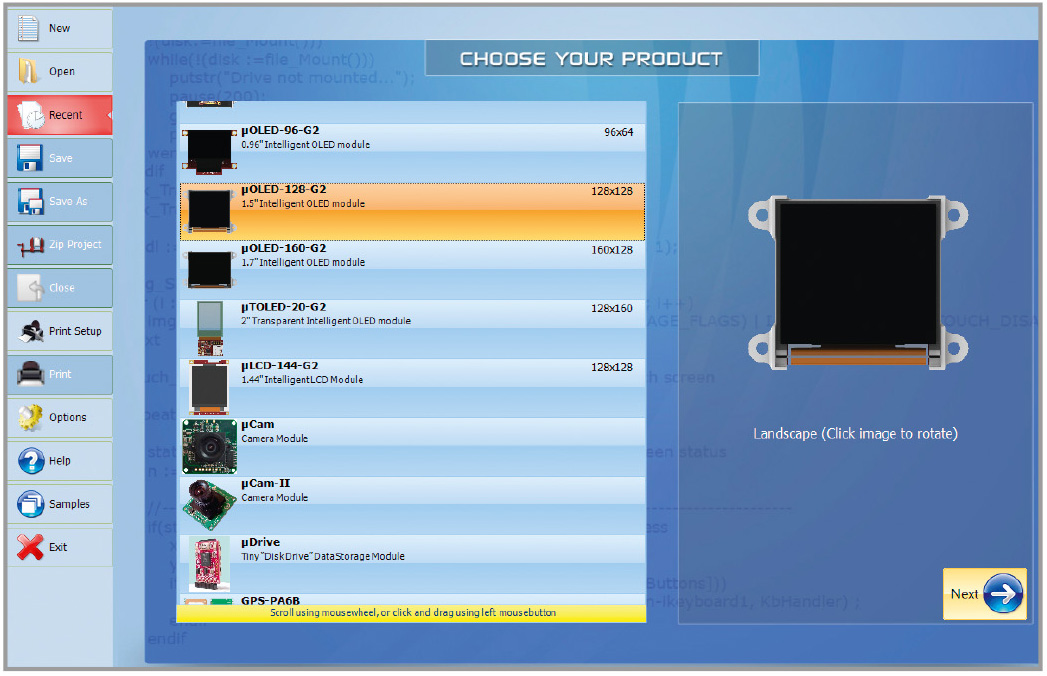 Для создания ViSi-проекта в главном окне Workshop4 IDE следует выбрать Create a new Project, после чего задать целевой дисплейный модуль (в нашем случае – µOLED-128-G2), как показано на рисунке 6, и нажать кнопку Next. Затем в открывшемся окне выбора вида проекта нажать кнопку со стрелкой около иконки ViSi, как показано на рисунке 7.