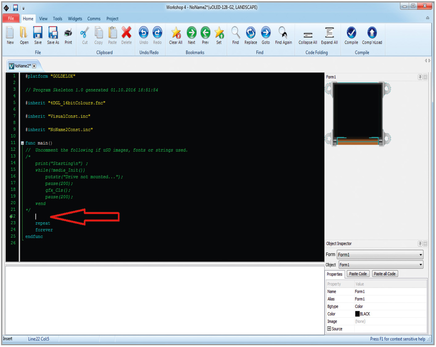 В шаблоне исходного кода следует установить курсор в позицию, отмеченную на рисунке 8 красной стрелкой. Необходимо отметить, что инициализация объекта в коде всегда должна предшествовать первому обращению программы к нему. В случае инициализации шрифта лучше расположить этот блок до начала основного цикла.