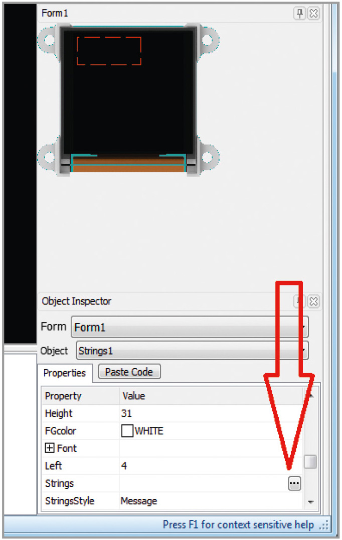 Затем в главном меню следует выбрать пункт Widgets и далее – вкладку Labels, из которой при помощи мыши перетащить иконку String на область дисплея, после чего выбрать в перечне параметров диспетчера объектов для объекта Strings1 строку позиции Strings, как показано на рисунке 10. В столбце Value, щёлкнув на кнопке выпадающего меню, открыть редактор шрифтов Strings Editor (см. рис. 11).