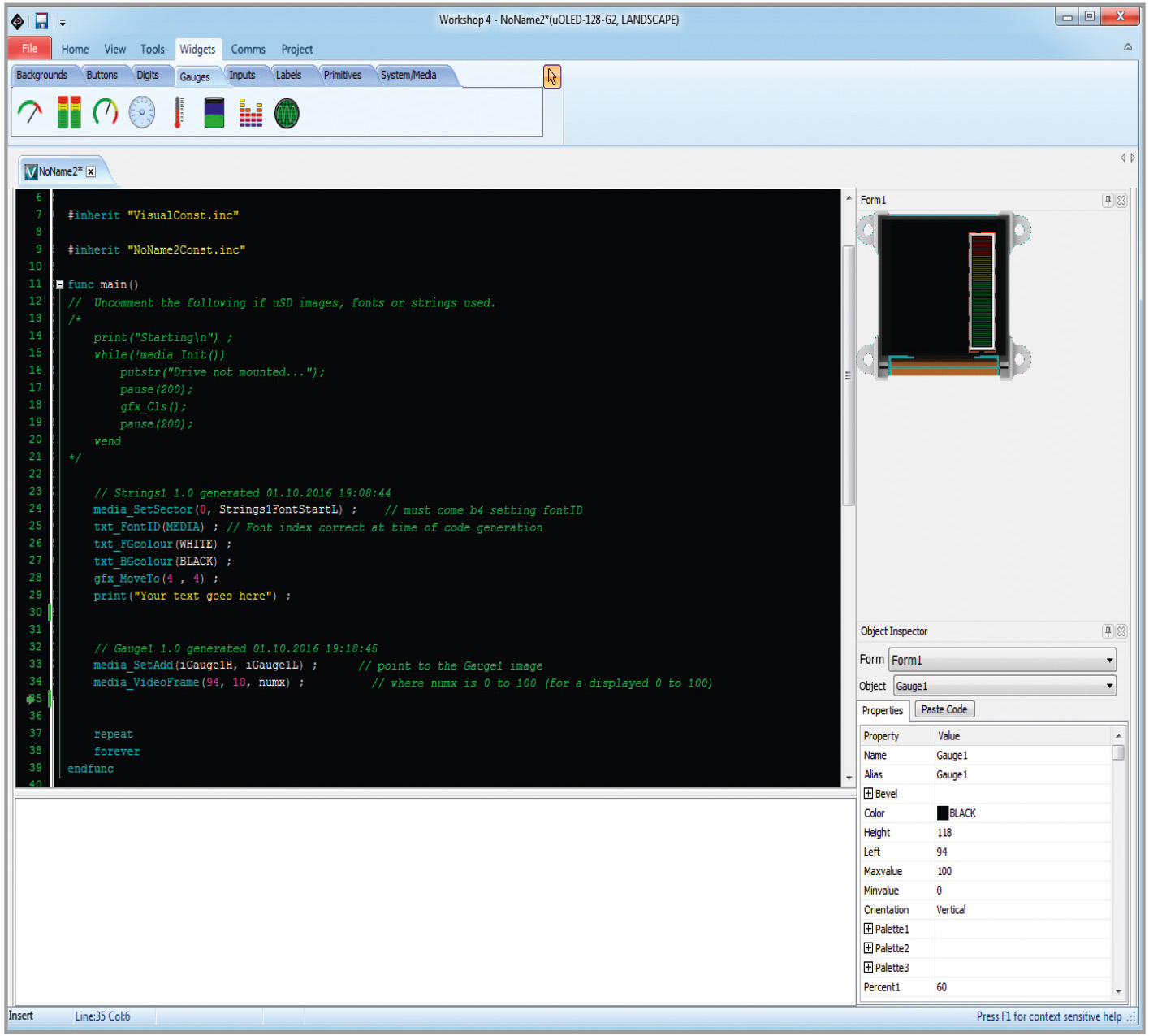 В окне редактора открытого файла исходного текста выбираем в главном меню пункт Widgets, затем – вкладку Gauges, из которой перетаскиваем мышью на область дисплея модуля иконку шкалы Gauge (см. рис. 12). При помощи мыши можно скорректировать размеры изображения шкалы и расположить его на дисплее нужным образом. Затем в диспетчере объектов можно изменить различные параметры объекта Gauge1 (цвет и т.д.). Как можно видеть, по умолчанию шкала имеет три области, каждой из которых задано по два цвета, соответствующие засвеченному и не засвеченному состояниям. Информация о цветах располагается в папках Palette1–Palette3. В нашем варианте во всех трёх папках используется одинаковая пара цветов, поэтому на дисплее шкала будет выглядеть однородной. Здесь же при необходимости можно скорректировать параметры Minvalue и Maxvalue, определяющие диапазон входной переменой шкалы.