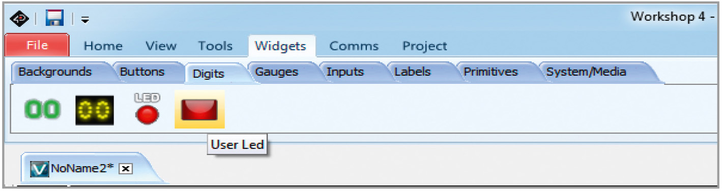В окне редактора следует выбрать в главном меню пункт Widgets, затем – вкладку Digits, из которой перетащить мышью на область дисплея модуля иконку прямоугольного светодиода User Led (см. рис. 13). Позже можно изменить размеры и местоположение изображения.