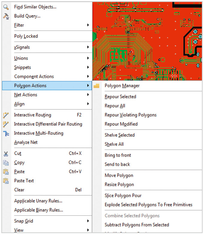 Часто возникает ситуация, когда необходимо отредактировать топологию в том месте, где наложен полигон. Естественно, сам полигон при этом будет сильно мешать. На этот случай в среде AD предусмотрена возможность отключения полигона. Для этого предназначены команды Shelve Selected и Shelve All. Первая скрывает выделенные полигоны, а вторая – все, присутствующие на ПП. Полигоны остаются в PCB-файле и могут быть восстановлены.