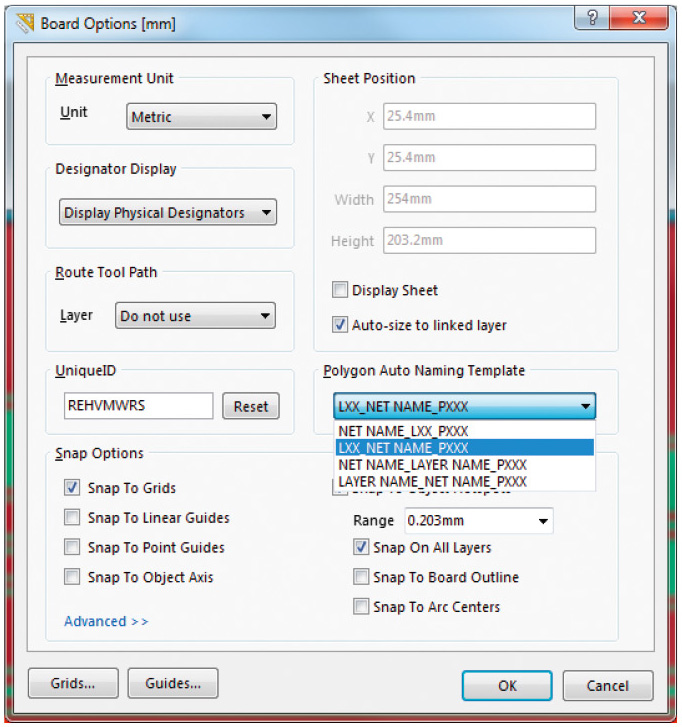 Автоматически формируемое имя полигона в том или ином виде содержит имя цепи, к которой он подключён, имя слоя и порядковый номер. Существуют четыре схемы автоматического наименования. Текущую схему можно поменять в поле Polygon Auto Naming Template окна Board Options (см. рис. 30), которое открывается по команде Design → Board Options. Данное поле содержит выпадающее меню, которое предлагает четыре схемы наименования. При выборе новой схемы имена существующих полигонов изменятся сразу во всём проекте [2].