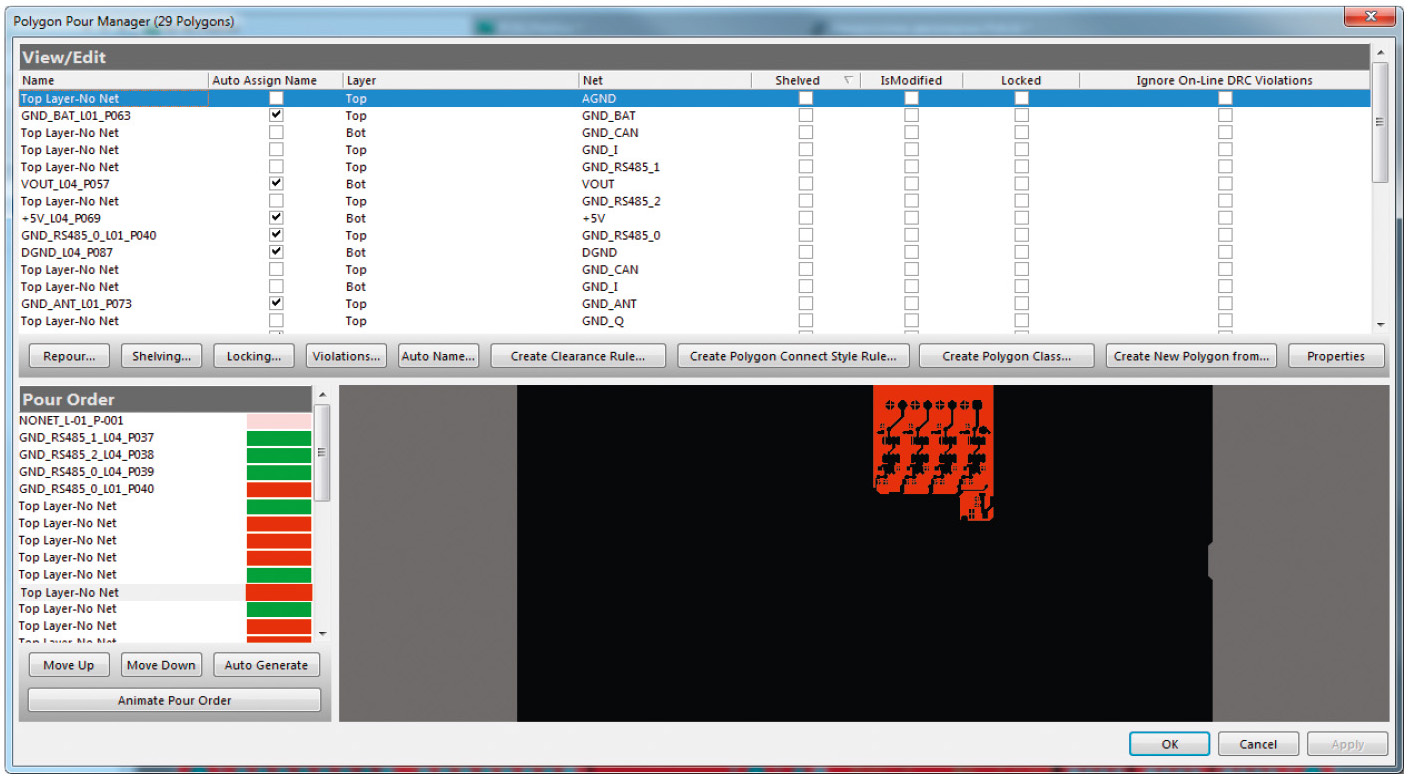 Нажатие расположенной в самом низу окна менеджера полигонов кнопки Apply приведёт к тому, что все внесённые в окне менеджера полигонов изменения будут применены к полигонам на ПП, но само окно останется открытым для дальнейшей работы, а нажатие кнопки OK приведёт к закрытию окна, но при этом для применения изменений все полигоны нужно будет перезалить [3].