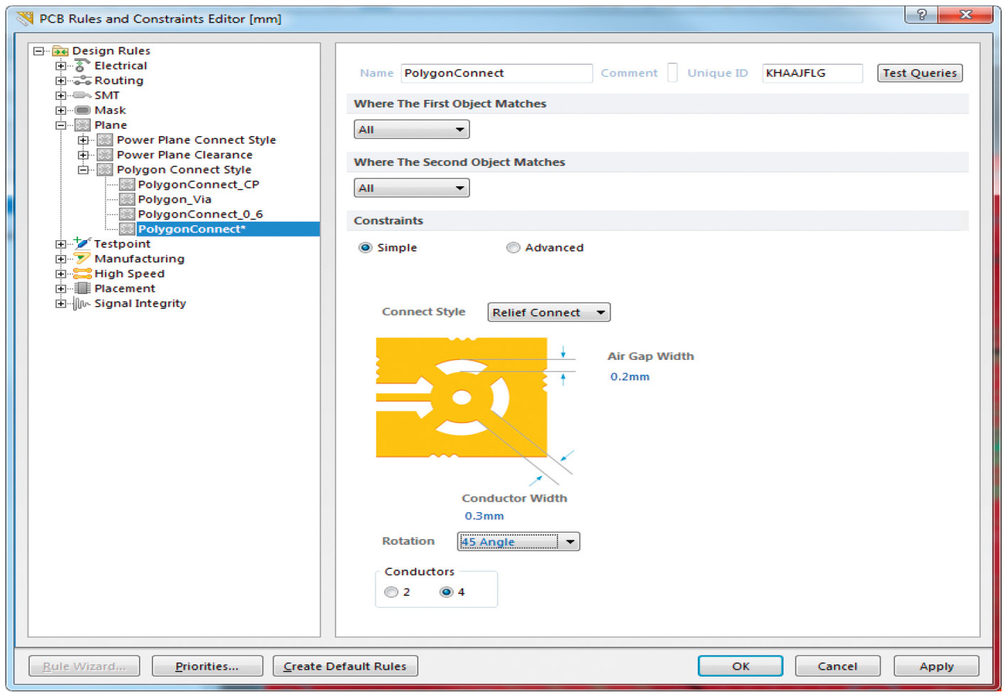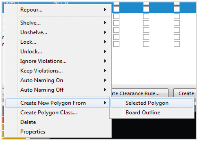 Кнопка Create Clearance Rule… позволяет создавать персональное правило зазоров полигонов, а кнопка Create Polygon Connect Style Rule… – правило подключения к контактным площадкам. В обоих случаях создаётся персональное правило для тех полигонов, которые выделены в таблице.