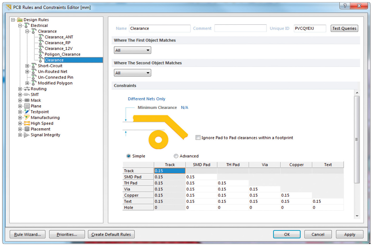 Величины зазоров определяются с помощью опций в поле Constraints. Если величина зазоров должна быть одинакова для всех объектов топологии, то её достаточно задать с помощью опции Minimum Clearance. Если же необходимо сформировать разные значения зазоров для разных объектов топологии, то сделать это можно с помощью таблицы зазоров, расположенной чуть ниже. Каждая строка и каждый столбец таблицы соответствуют определённому объекту топологии. Зазор задаётся отдельно для каждой пары объектов. Для этого первым щелчком ЛКМ выделяется ячейка, расположенная на пересечении строки одного объекта и столбца второго, а вторым щелчком ЛКМ она активируется, и вводится новое значение. На рисунке 34 отображён упрощённый вариант таблицы. Величины зазоров, связанных с полигональными объектами, задаются с помощью строки или столбца Copper.