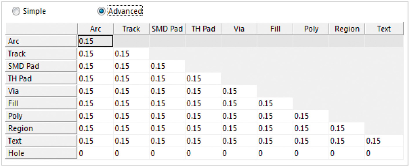 Если необходимо для каждого вида полигональных объектов задать собственную величину зазора, то таблицу необходимо перевести в расширенный режим (см. рис. 35). Для этого нужно перевести в положение Advanced расположенный над таблицей переключатель. В расширенном режиме таблицы строка Copper, соответствующая полигональным объектам, преобразуется в три строки, каждая из которых соответствует одному из видов полигональных объектов: