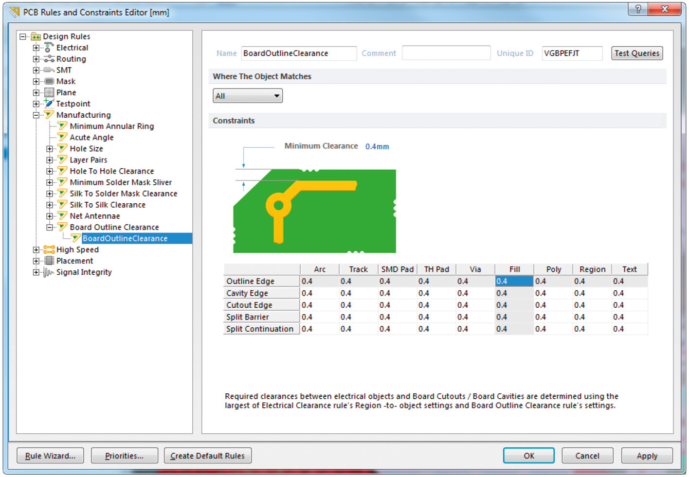 Приёмы работы с данным правилом аналогичны приёмам работы с правилом Clearance. Величины отступов определяются с помощью опций в поле Constraints. Если величина отступов всех элементов топологии от всех видов границ платы должна быть одинаковой, то её достаточно задать с помощью опции Minimum Clearance. Если же для разных элементов топологии или разных видов границ ПП необходимо определить разные значения отступов, то это можно сделать с помощью расположенной ниже таблицы отступов. Каждая строка таблицы соответствует одному из типов границы ПП: